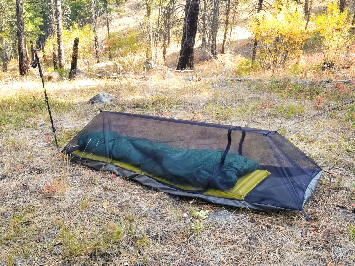 This is our ultralight bug bivy, constructed with 0.7oz no-see-um netting. It is very close in design to our standard bivys, but with a full netting top. This allows for complete bug protection while also having unparalleled breathability, and serves as a groundsheet. The bottom is made with waterproof 1.3oz 20D silpoly